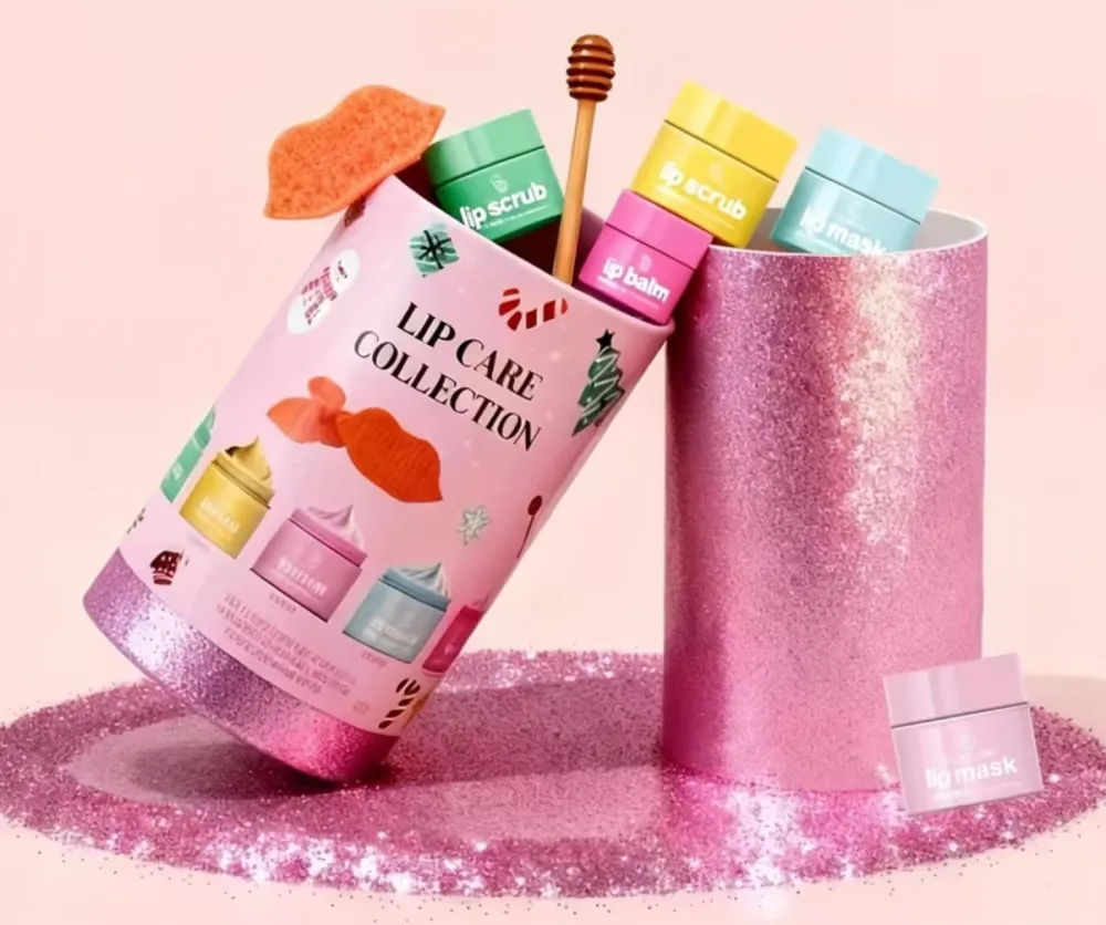 ومقشر سحري ومرطب شفاه مكون من 7 قطع: يقشر ويغذي ويرطب. مع فيتامين C، الخوخ الأبيض، العنب العصاري، البسكويت، التوت، ونكهات العسل .